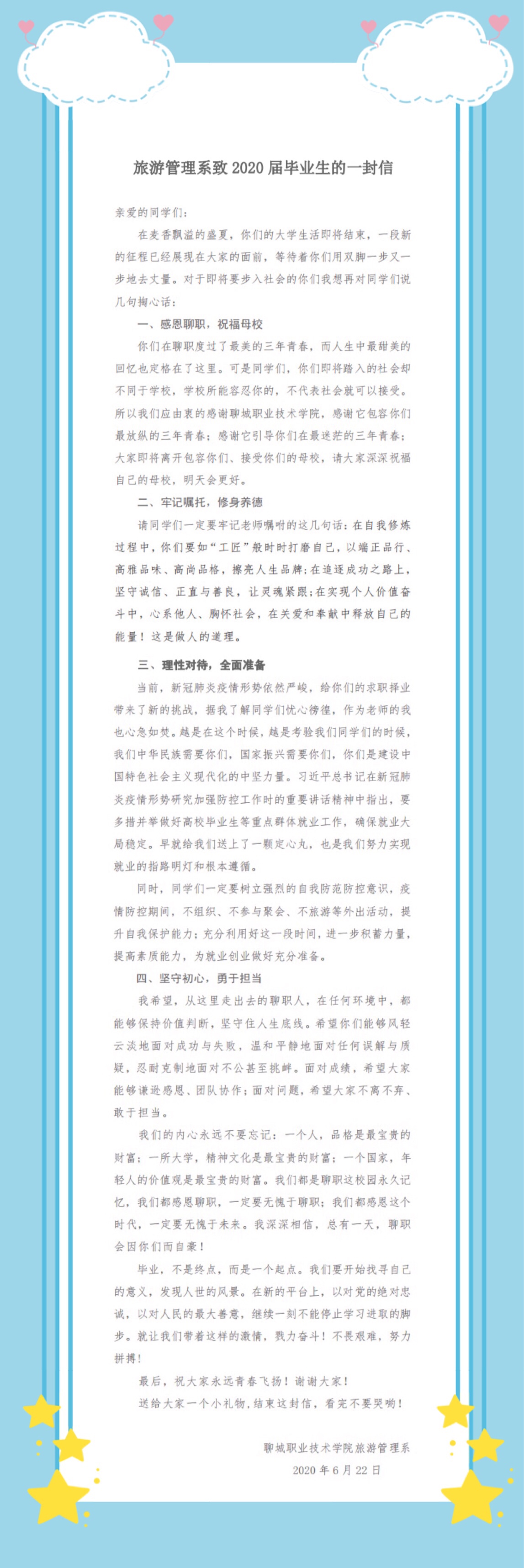 相见时难别亦难。旅游管理系全体老师对于毕业生有不舍、有祝福、有嘱托、有担心……离别信纸短情长,再会时别来无恙。