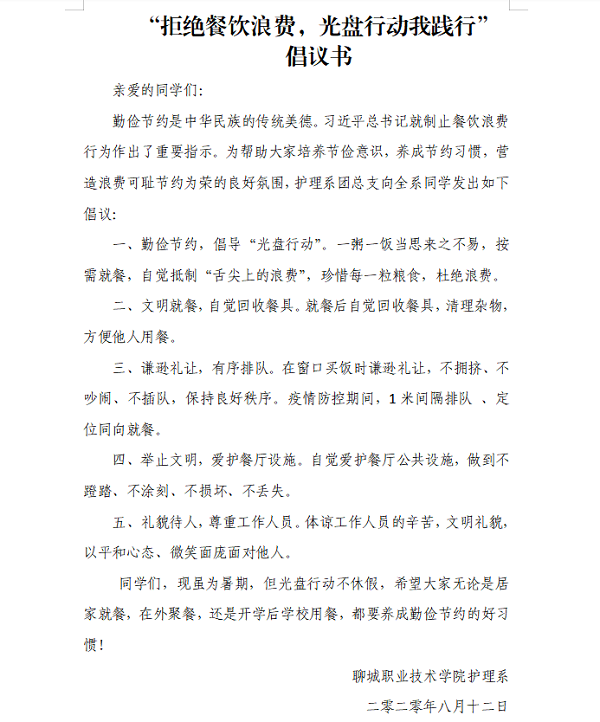 倡议书, 凝心聚。护理系通过QQ群、微信群、视频会议向全体同学发放了一份“拒绝餐饮浪费,光盘行动我践行”的倡议书,号召全系师生按需文明用餐,拒绝浪费。