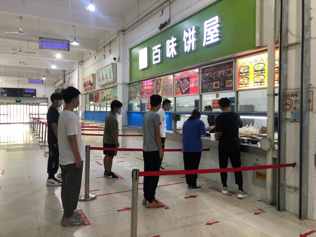 在学校餐厅,演练围绕进入餐厅、排队打饭、就餐等多个环节进行,包括入餐厅前的洗手消毒,排队时保持一米间距等细节。