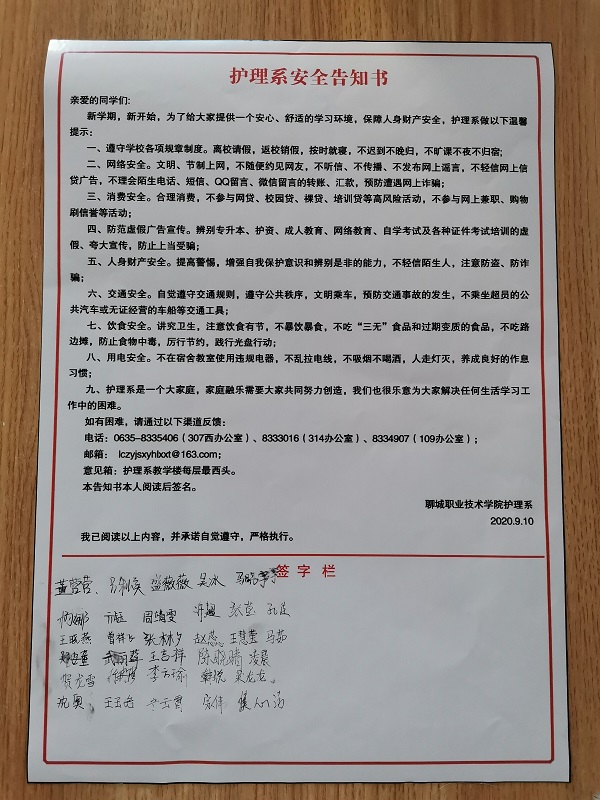 召开网络安全主题班会。班主任用贴合生活的案例为学生直观的讲解网络应用的弊端和优势,引导学生学会正确利用网络。主题班会上,学生签署了《护理系安全告知书》,承诺要文明节制上网,提高警惕,避免陷入网络陷阱。