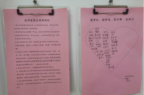 “九一八”期间,正值上学期未返校的2019级学生期末考试之时。为进一步引导同学们不忘国耻,努力学习,奋发图强,报效祖国,医学系近期开展了学风建设及诚信考试月系列活动,包括签订“诚信考试承诺书”、进行诚信考试宣誓、召开“班级学风建设与个人学习成才规划”主题班会、每位同学提交“个人学习成才规划书”等等,通过一系列活动,进一步激励同学们以实际行动实践报国之行。