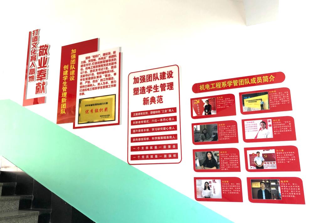 机电工程系党建文化墙覆盖了一号教学楼南区三楼至五楼走廊,红色主题标识墙引人注目,将党建文化、红色文化与智能制造专业文化深度融合,图文并茂,内容涵盖“智筑梦想、造就辉煌”党建品牌、创新型学生支部、党员风采、新中国史及工业制造史、党史、“党建引领专业育人”、社会主义核心价值观等。