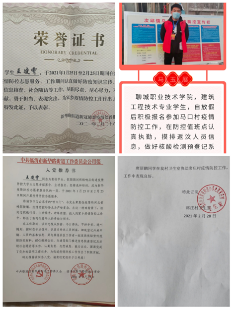 2020级造价二班王凌霄、2019级建筑工程技术二班马玉展、席居鹏,寒假期间面对疫情防控的严峻形势,毫不退缩、义无反顾地投身到家乡防疫志愿服务中,为抗击疫情贡献自己的力量。他们说:“作为团员,主动请缨义不容辞,为防疫尽绵薄之力,这也是我们送给自己最好的成人礼。”作为新时代的青年大学生,他们在家乡和祖国需要的时候尽己所能,守护一方百姓安康,体现了新时代好青年的责任和担当。