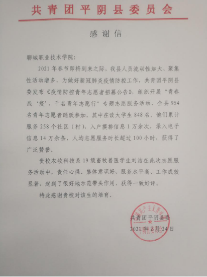 3月8日,农牧科技系收到两封特殊的快递,是由山东省平阴县团委发来的感谢信。信中这样写道:“贵校农牧科技系19级畜牧兽医学生任可鑫、刘洁在此次志愿服务活动中,责任心强、集体意识好、服务水平高、工作成绩显著,起到了很好的示范带头作用,获得一致好评。特此感谢贵校对该生的培育。”