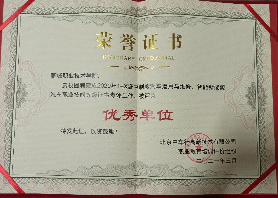 近日,聊城职业技术学院获得北京中车行高新技术有限公司职业教育培训评价组织颁发的“优秀单位”荣誉证书,以表彰我校在1+X证书制度试点工作中的突出贡献。