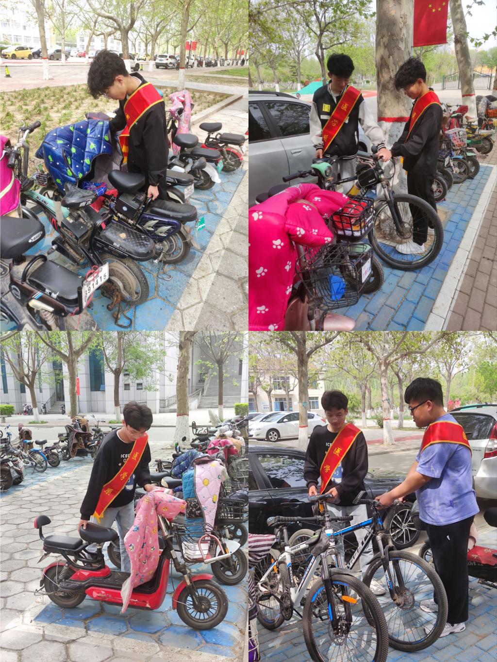 四是开展“单车整齐归类,校园美好共存”文明创建志愿服务。针对校园内无序停放的自行车进行集中调摆,开展文明骑行宣传。引导同学们把共享文明、绿色出行变成一种自觉行为,营造安全、洁净、有序的校园环境。