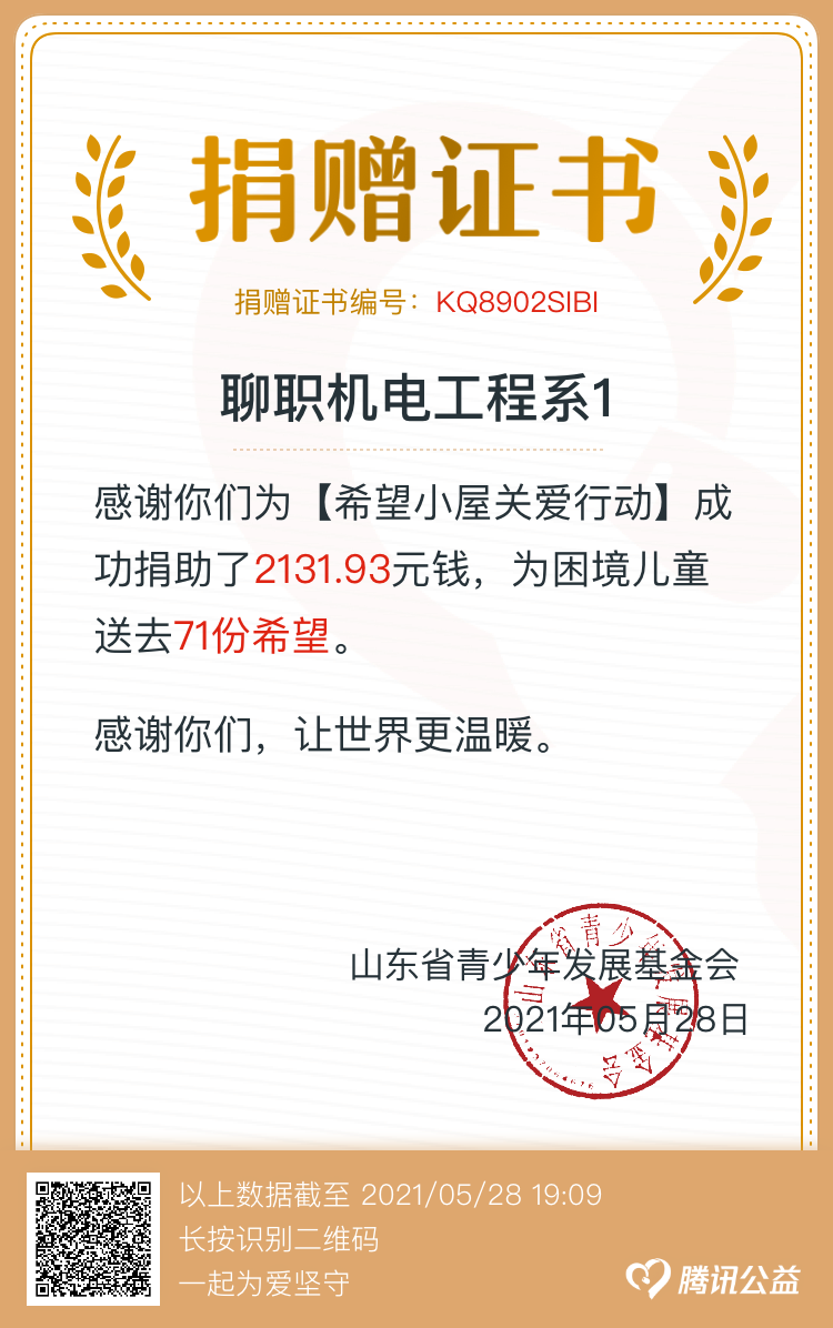 为响应上级组织“为贫困儿童办实事”的号召,切实改善贫困儿童生活与学习环境,关爱贫困地区儿童。近日,机电工程系在1号教学楼前组织开展“希望小屋”爱心公益募捐活动。
