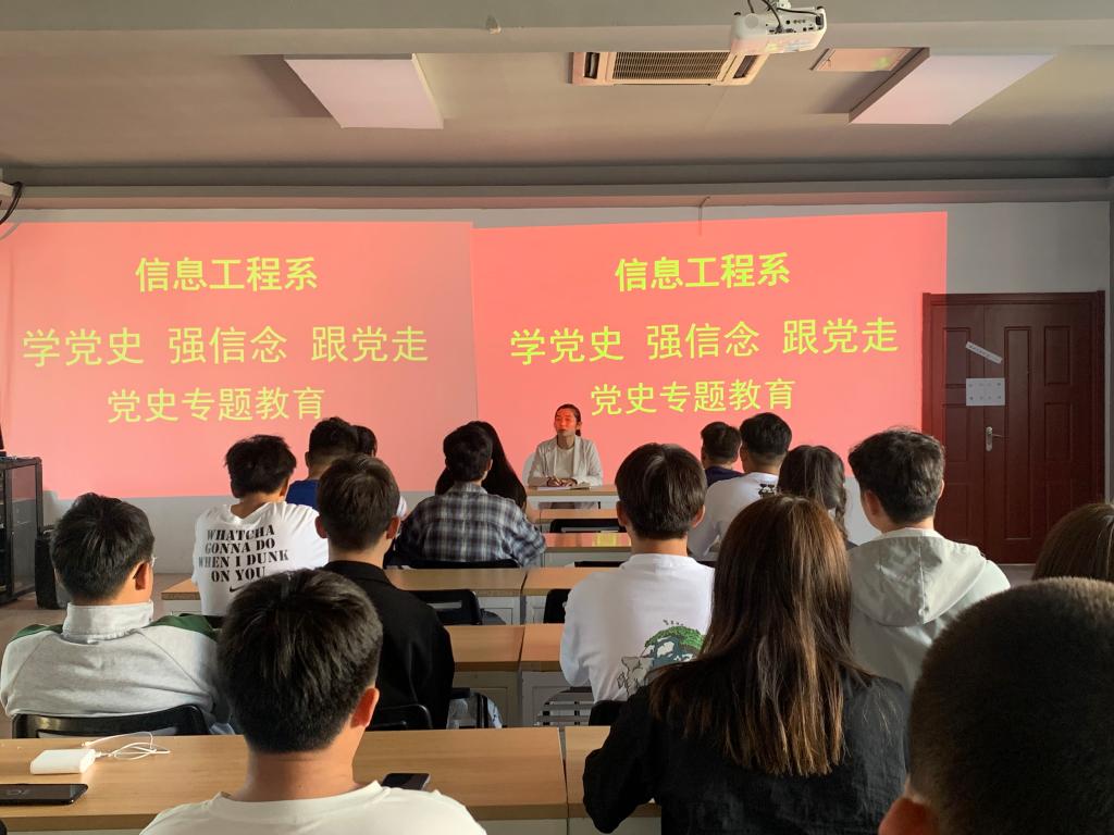 线上线下学党史。组织学生参加“青年大学习”网上主题团课学习,利用公众号发布党史学习专栏,通过线上专题活动使学生充分认识到党史学习的重要意义。信息工程系辅导员定期组织团员青年开展党史专题学习教育,深入了解党的光辉历程。