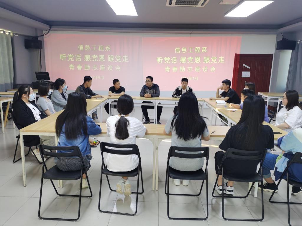 励志座谈跟党走。信息工程系举办了“听党话 感党恩 跟党走”励志座谈会。邀请了曾获国家励志奖学金的学生与大一学生展开座谈。优秀学生干部吕艳全同学在校期间曾十数次获得优秀志愿者称号。作为我系青协主要学生干部的他秉承“奉献、友爱、互助、进步”的宗旨,用实际行动告诉同学们:“知恩与心,感恩于行。”