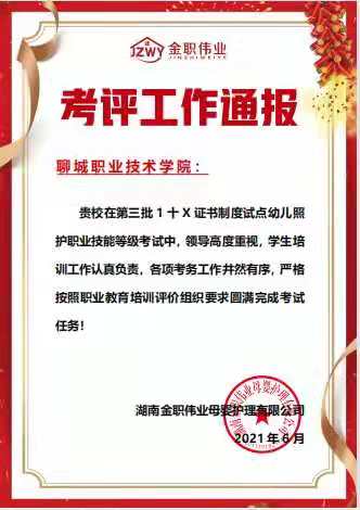 6月20日,聊城职业技术学院护理系高质量完成教育部“幼儿照护”1+X职业技能等级考试工作,护理专业80名学生“理论+实践操作”全部高分通过,通过率100%。