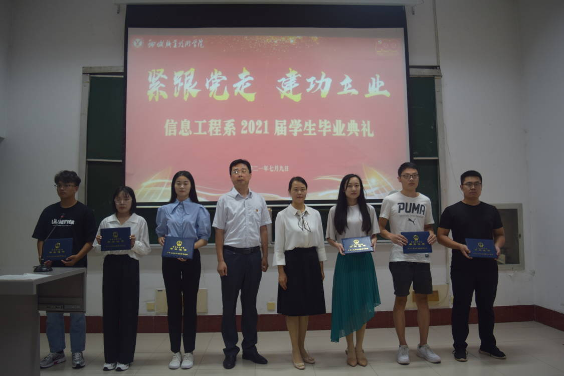7月9日上午,信息工程系“紧跟党走,建功立业”2021届学生毕业典礼在阶梯二教室举行。