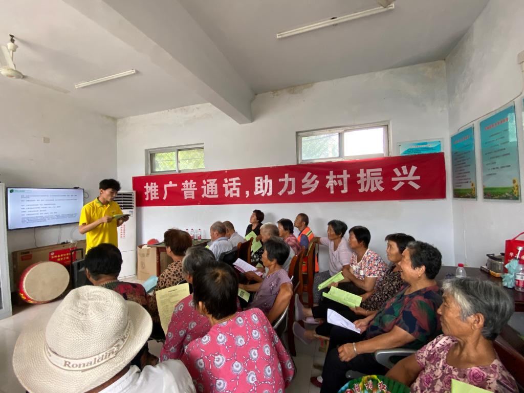 科普组利用课件讲解、发放宣传单页的形式向村民详细宣讲安全用电、垃圾分类、防溺水、防电信诈骗等知识,进一步增加乡村人民对科学、卫生、文化等相关知识的了解,提高人民知识素养,改善居民生活习惯。推普组深入了解村民的普通话掌握水平,张贴推广普通话条幅,通过游戏的形式帮助村民调整发音,帮助村民录制标准普通话版本的乡村广播。