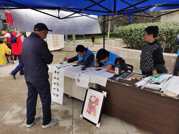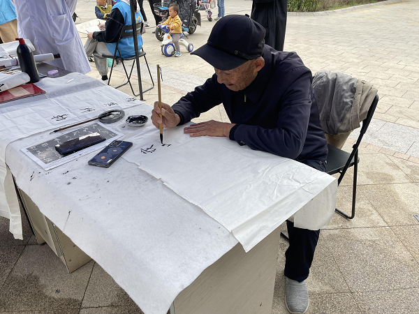 挥洒笔墨暖夕阳。活动现场,护理系书法社团“华艺阁”志愿者们充分发挥各自特长优势,为来往的居民写书法,画速写。一位七旬老人,参与到毛笔字书写中,亲自写下一幅毛笔字送给了在场志愿者。青年志愿者用热情周到的服务,温暖了老人们的心,老人纷纷表示希望志愿者们常来社区做活动。
