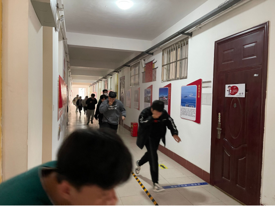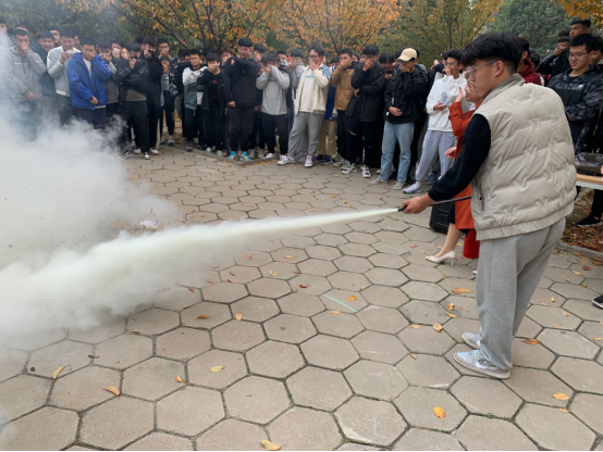 随着一声紧急响亮的哨声警报,同学们迅速捂住口鼻,弯腰,沿着逃生通道有序撤离。短短1分钟30秒,所有学生全部安全撤离,到达安全场地后,辅导员老师对此次疏散演习情况作总结,充分肯定了大家在“突发火灾”的镇定表现,并为大家演示了干粉灭火器的使用方法,演示了查看灭火器压力、晃动灭火器保证干粉松动、拔掉塑封和保险销、喷射灭火等步骤,随后,进行灭火实践演练。