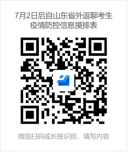 7月2日上午9:00后自山东省外返聊考生均需扫描下方二维码,填写疫情防控信息摸排表。相关考生扫码采集信息应于2022年7月4日下午16:00前完成,不在规定时间进行填报或不如实填报,引起疫情传播的,考生承担相应法律责任。
