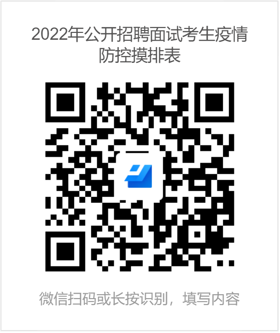 所有参加面试的考生请于2022年7月18日上午12:00前扫描下图二维码,填写面试考生疫情防控摸排表。不在规定时间进行填报或不如实填报,引起疫情传播的,考生承担相应法律责任。