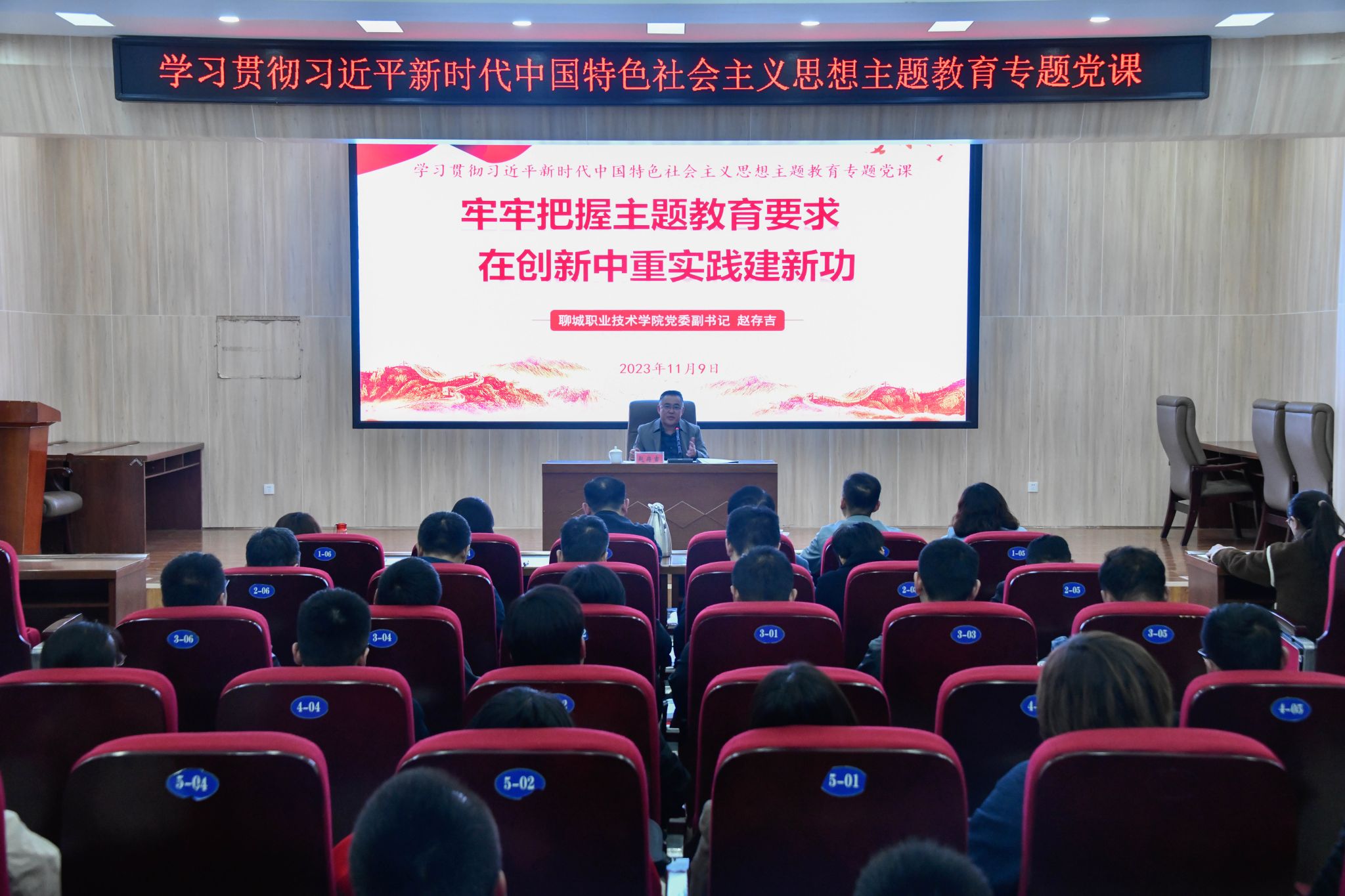 11月9日,聊城职业技术学院党委副书记赵存吉以“牢牢把握主题教育要求 在创新中重实践建新功”为题,为学校党员干部教师讲授专题党课。