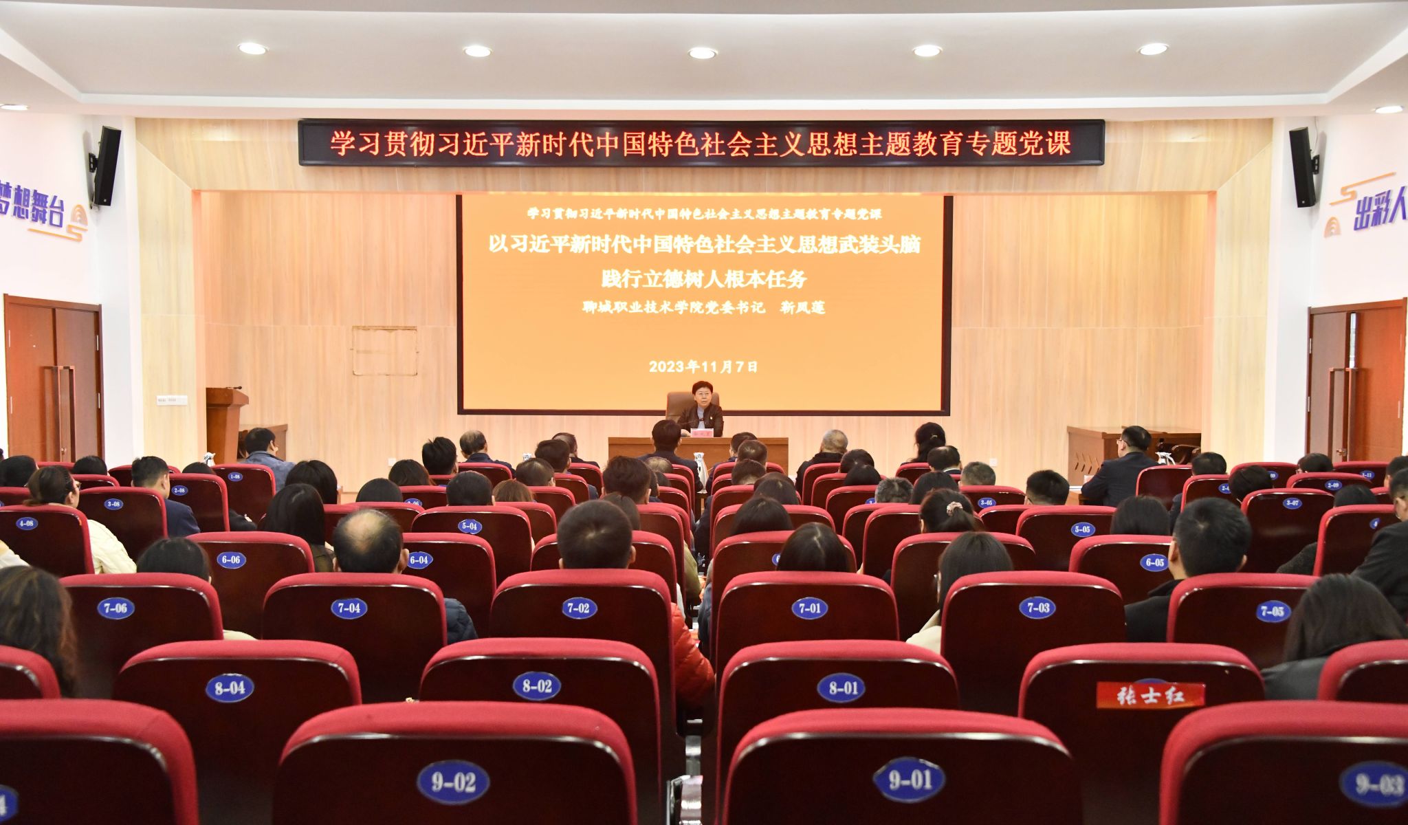 学校党委领导班子成员,各部门主要负责人,各党总支书记副书记、各直属党支部书记、教工及学生党支部书记、全体思政教师聆听了党课。